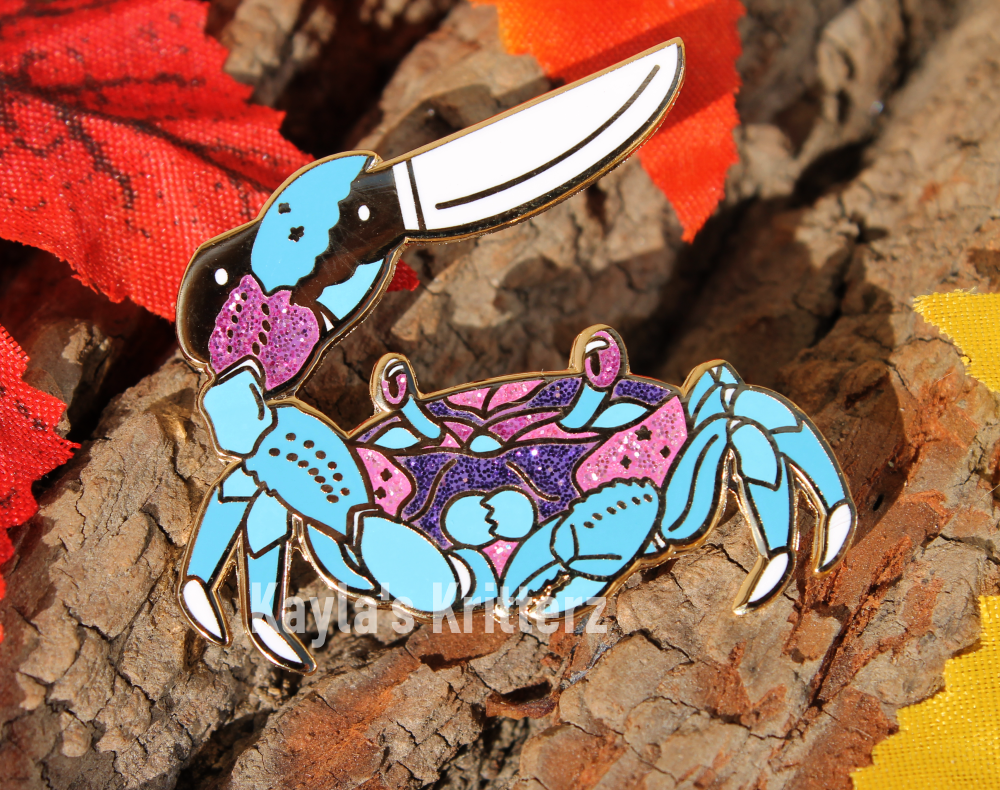 This galaxy crab is armed and ready with a little knife. Each pin is gold plated and full of beautiful color, and packed with glitter!